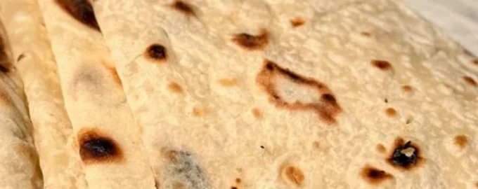 - Del dejen i 8 lige store stykker på ca. 100 g hver, rul dem tyndt ud, og steg dem på en omvendt opvarmet bageplade på begge sider som vist i videoen.