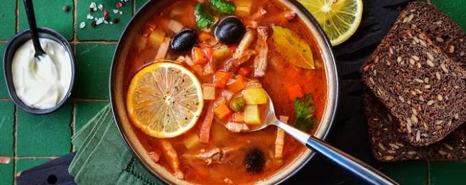 - Solyanka præfabrikeret er klar – den skal bare tages af ilden og stå i 10-20 minutter. Den kan serveres med dild og creme fraiche.